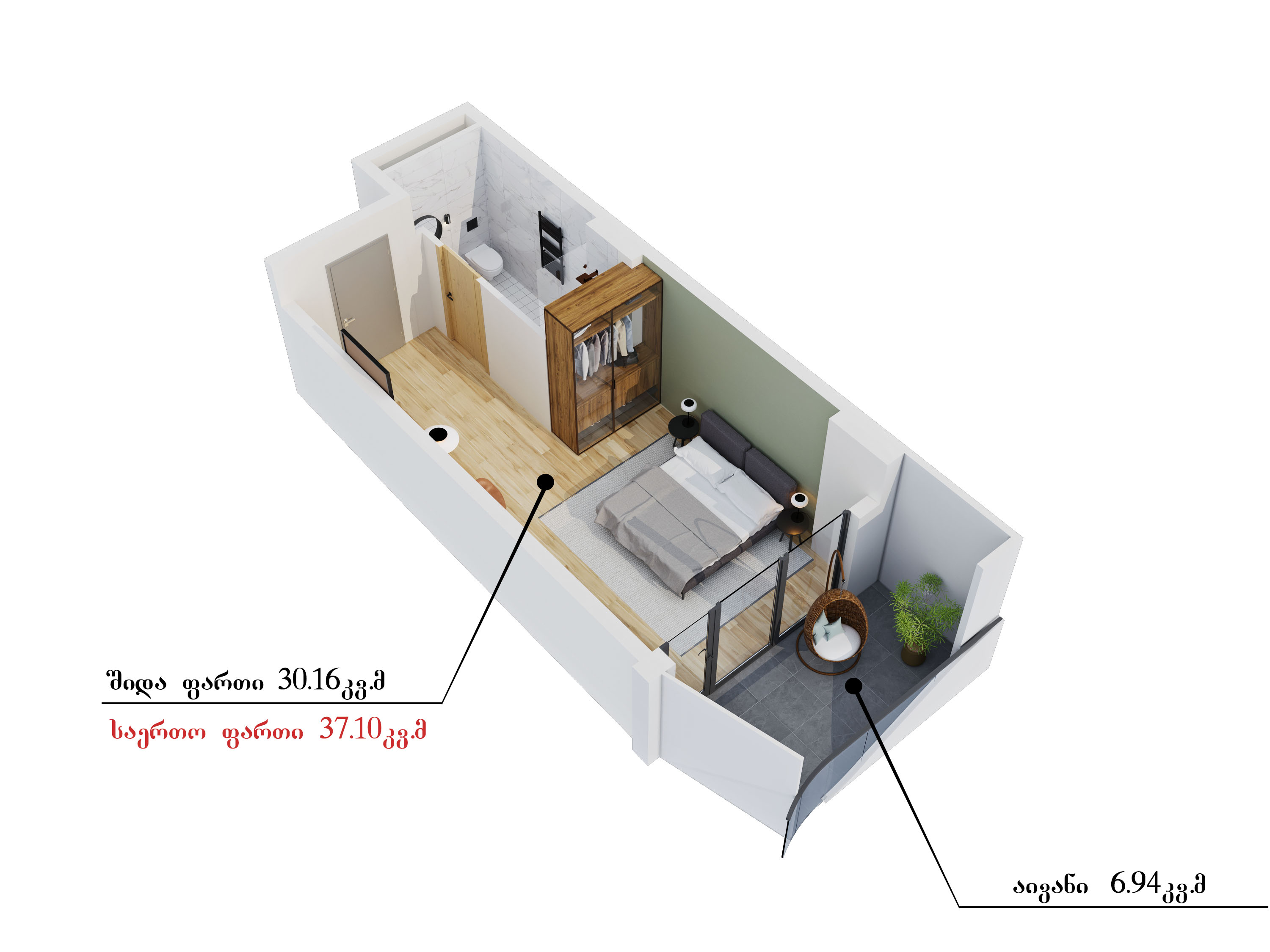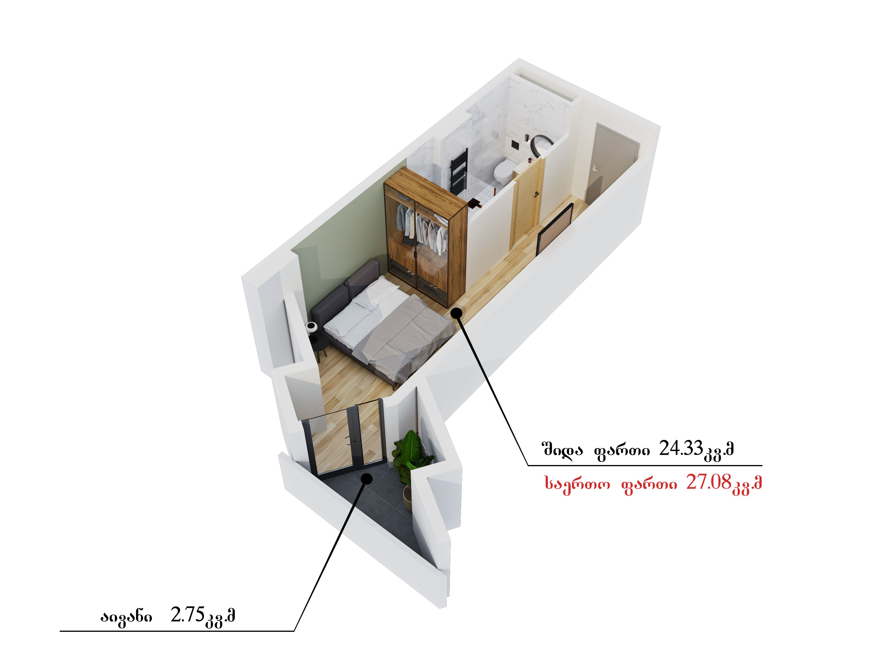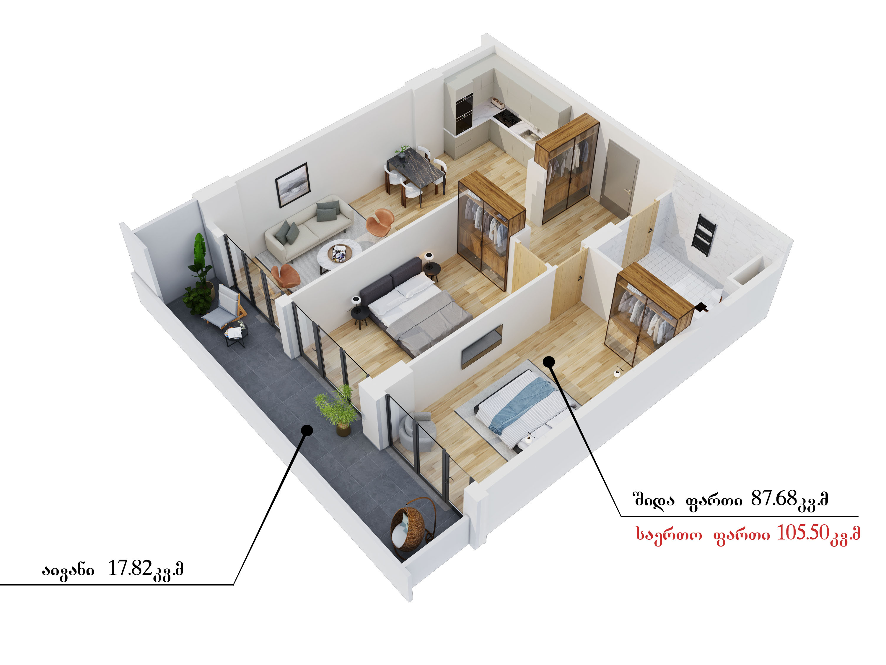 კომერციული ფართები გვაქვს 98 კვადრატულიდან, საოფისე ფართები - 195 კვადრატულიდან, 1 ოთახიანი, სტუდიოს ტიპის ბინები - 27 კვადრატულიდან, 1 საძინებლიანი ბინები - 65 კვადრატულიდან, 2 საძინებლიანი ბინები - 75 კვადრატულიდან, 3 საძინებლიანი ბინები -100 კვადრატულიდან.