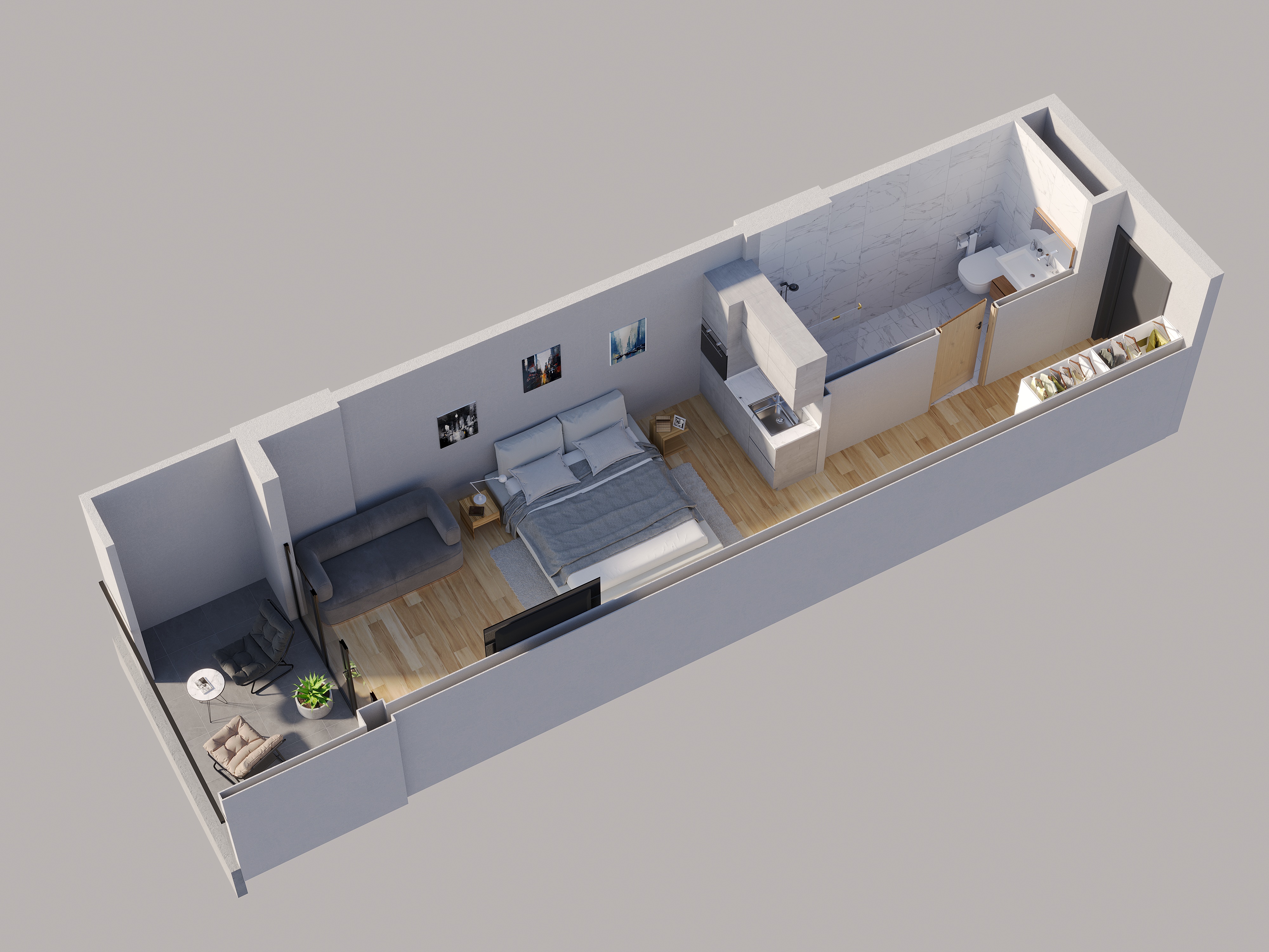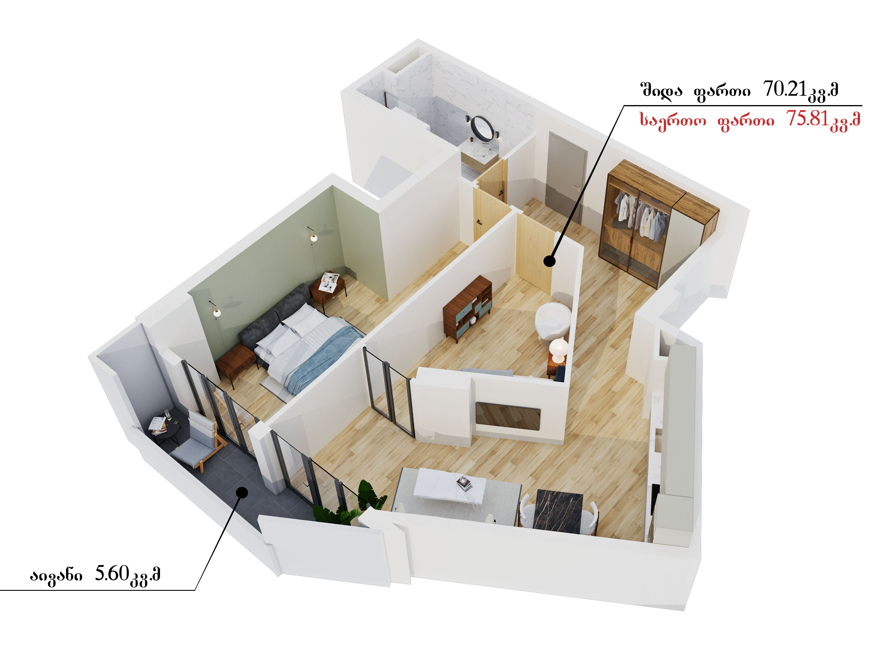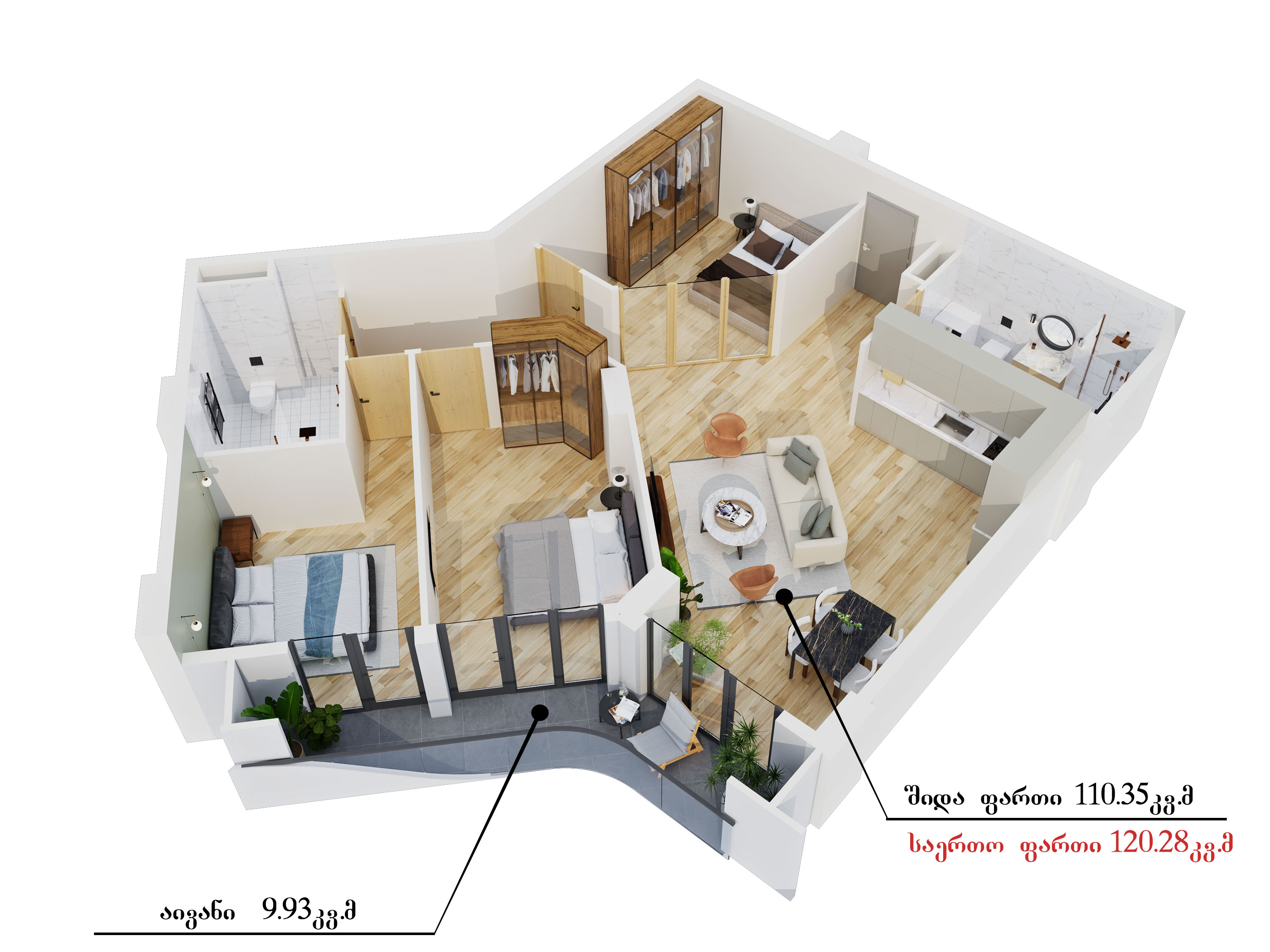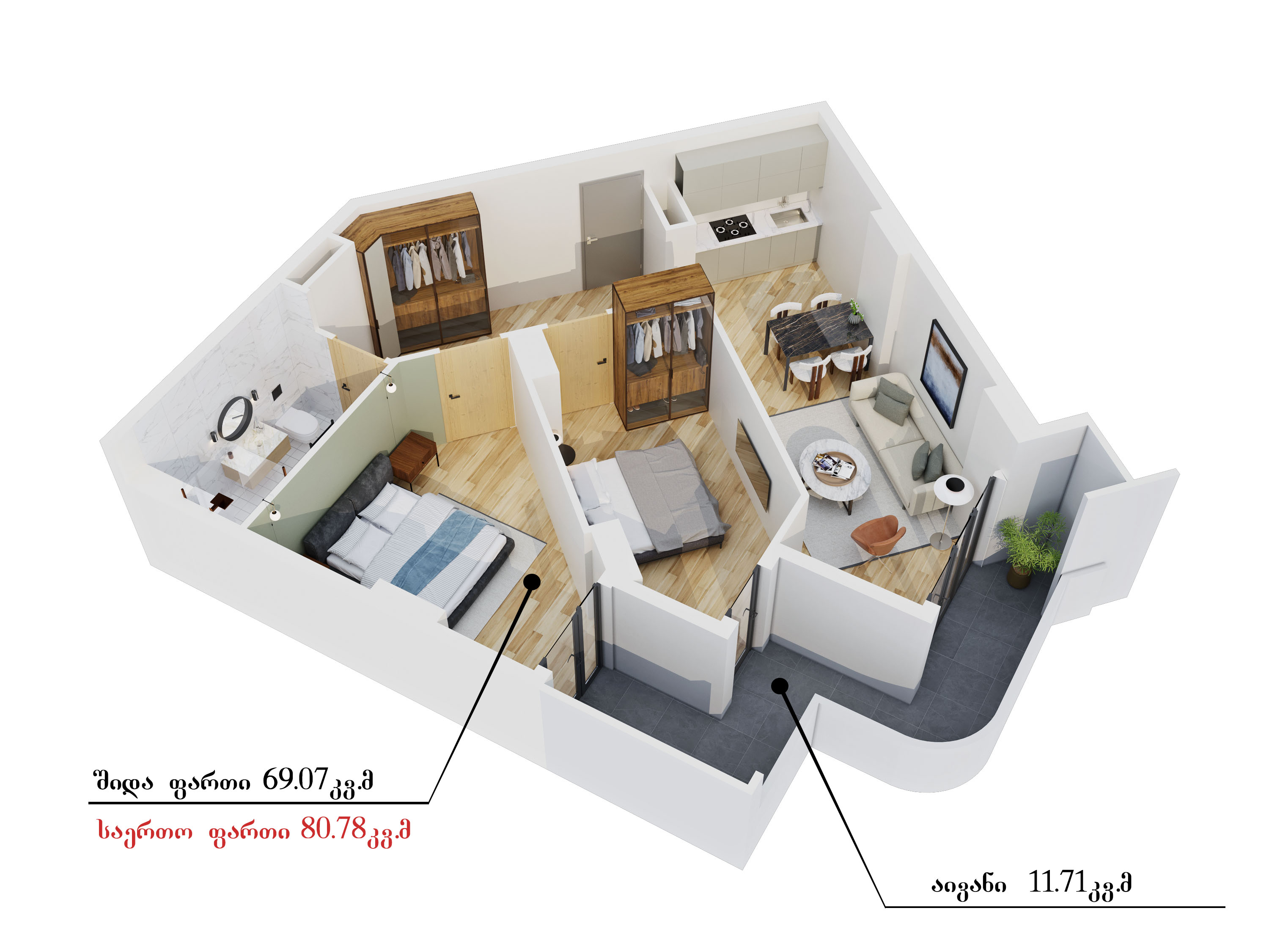 კომერციული ფართები გვაქვს 98 კვადრატულიდან, საოფისე ფართები - 195 კვადრატულიდან, 1 ოთახიანი, სტუდიოს ტიპის ბინები - 27 კვადრატულიდან, 1 საძინებლიანი ბინები - 65 კვადრატულიდან, 2 საძინებლიანი ბინები - 75 კვადრატულიდან, 3 საძინებლიანი ბინები -100 კვადრატულიდან.