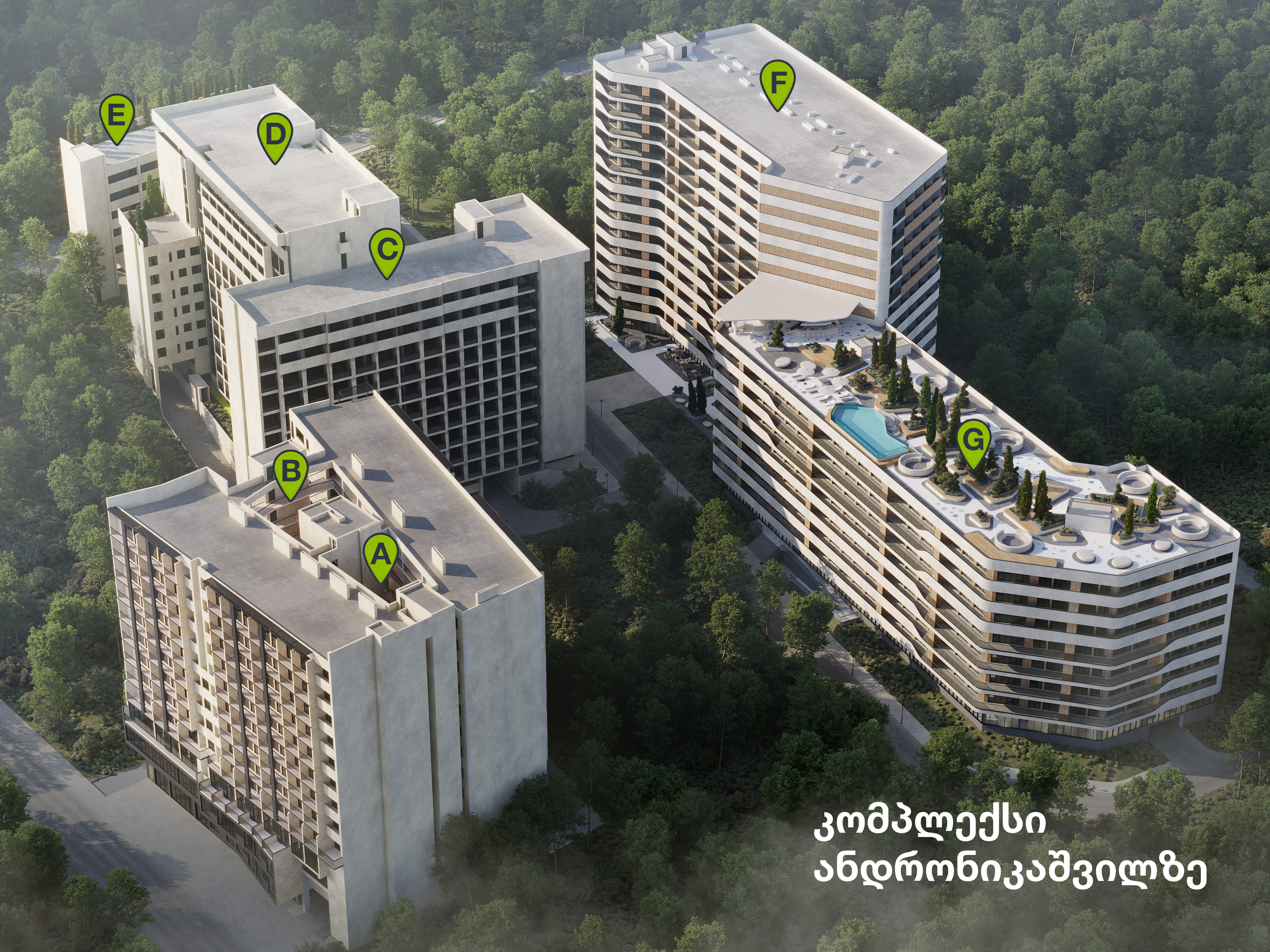 კომპლექსი განლაგებულია 15 000 კვადრატულზე, სადაც თქვენ დაგხვდებათ გამწვანებული ეზო, საბავშვო სივრცეები, სპორტული მოედნები, კაფე-ბარები, ღია და დახურული აუზები, ქვედა პარკინგები, 24 საათიანი დაცვა, კონსიერჟი - ყველაფერი ერთ სივრცეშია თქვენი კომფორტული ცხოვრებისთვის.